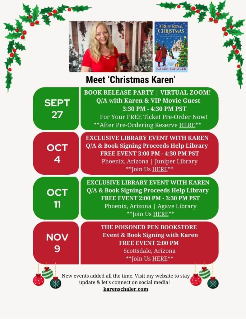 I’d love for you to join me at these fun and festive events celebrating my new Christmas romantic comedy, A Royal Ruff Christmas! What do you think? Who wants to come?!!